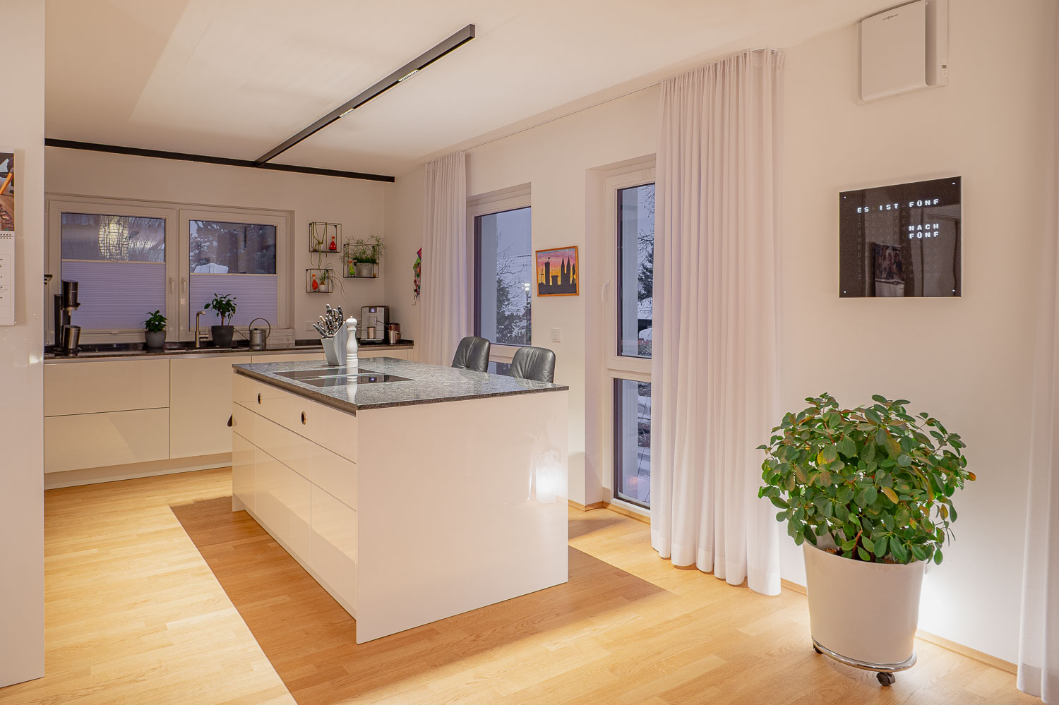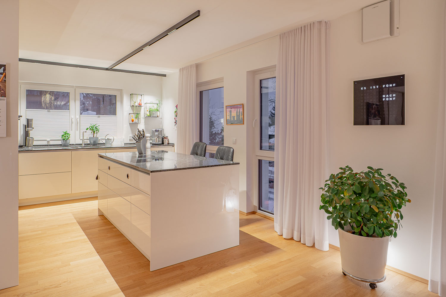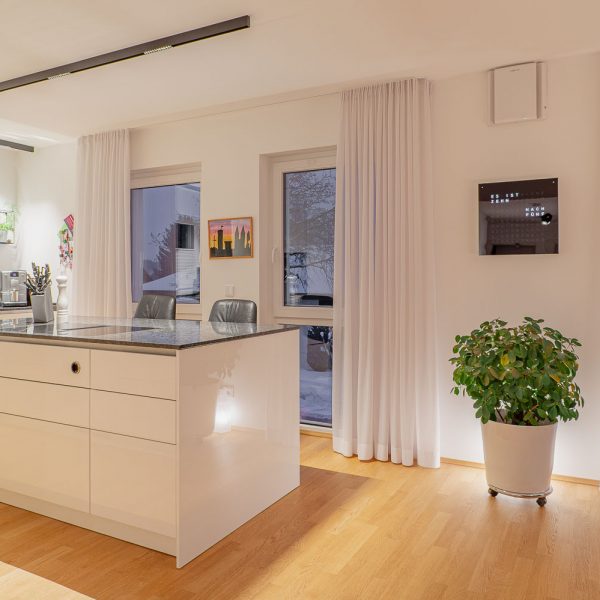Alle Leuchten sind einzeln steuer- und dimmbar, sodass unterschiedliche Lichtszenen für Kochen, konzentriertes Arbeiten oder entspannte Abende geschaffen werden können. Gesteuert wird das System im Alltag klassisch über einen Lichtschalter mit CASAMBI Funktion von Busch Jaeger, während die CASAMBI App-Steuerung volle Flexibilität bietet: Jede Leuchte und jedes Szenario lässt sich individuell anwählen und anpassen.