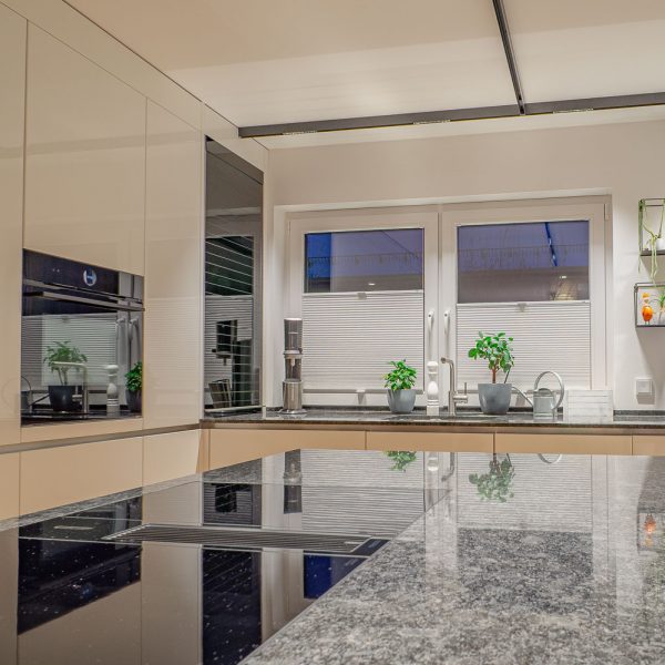 Die eingesetzten Leuchten erzeugen ein stark gerichtetes, zugleich extrem blendfreies Licht. Beleuchtet werden ausschließlich Arbeitsplatte und Kochinsel, gezielt und akzentuiert – genau dort, wo gutes Licht in der Küche wirklich gebraucht wird und Materialien, Strukturen und Farben optimal zur Geltung kommen.